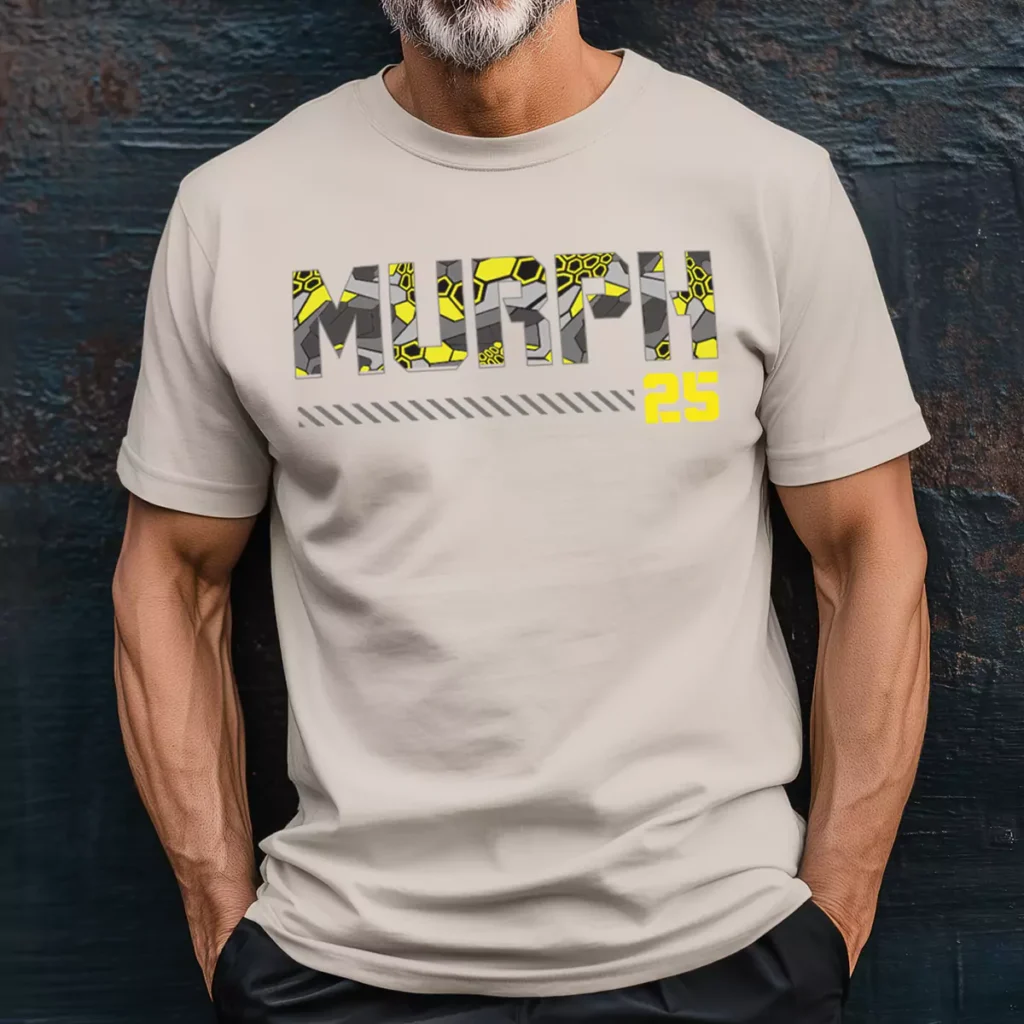 These gym shirts are built to feel more like a drop than a handout. The hexagon texture and yellow contrast give it an athletic energy that holds up well outside the gym too. It's the kind of Murph tshirt people actually keep around instead of retiring to the bottom of the drawer.