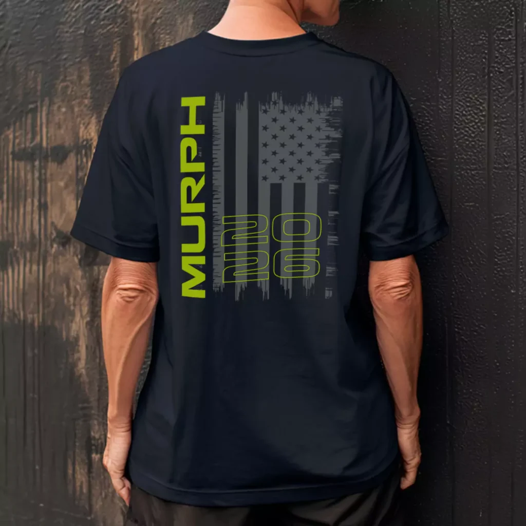 Neon on navy is a combination that shows up in performance athletic wear for good reason — it hits hard and reads fast. Using it for Murph tshirts is an unconventional call that works because the flag keeps the graphic grounded. The tonal front logo keeps it clean enough to wear as a regular gym shirt while the back makes a statement the moment you turn around. This one belongs in a portfolio specifically because it goes somewhere most Murph shirts don't.