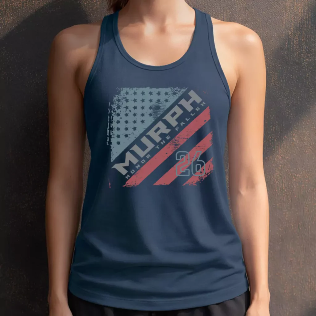 The rotated flag layout is one of the more dynamic compositions in this portfolio — the diagonal pulls your eye across the whole chest rather than reading top to bottom. Putting "HONOR THE FALLEN" directly on the banner gives this Murph shirt a phrase that sits right next to the name and earns it. Navy was the right base for the muted blue and red palette, keeping the color from going flat. These Murph tshirts are for gyms that treat the day as a tribute, not just a tradition.