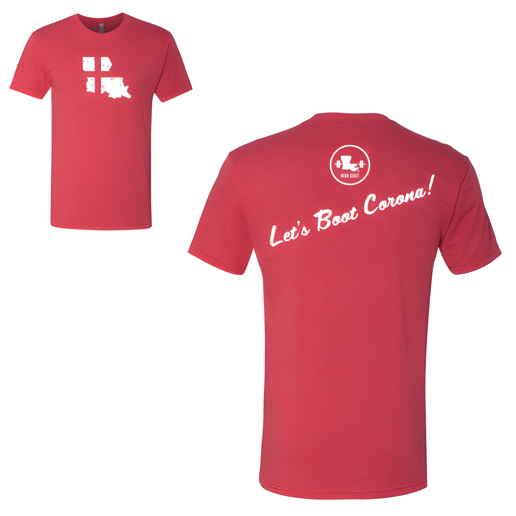 We placed the Iron Boot name bold above "Let's Boot Corona" for a playful defiant fundraiser look. The tee was chosen for its comfortable fit and message driven design. Centered chest placement keeps the rally cry front and center.