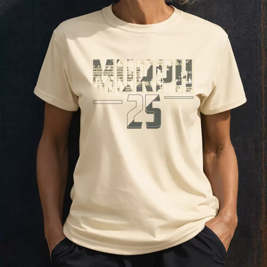The jersey numeral treatment turns the year into something that feels earned rather than stamped on, which is the right call for Murph. The pixelated text fill inside the letters rewards anyone who gets close enough to read it, while still reading as a bold graphic from across the gym floor. These Murph tshirts wear like athletic keepsakes and the cream colorway makes the charcoal ink feel more considered than a standard white gym shirt would.