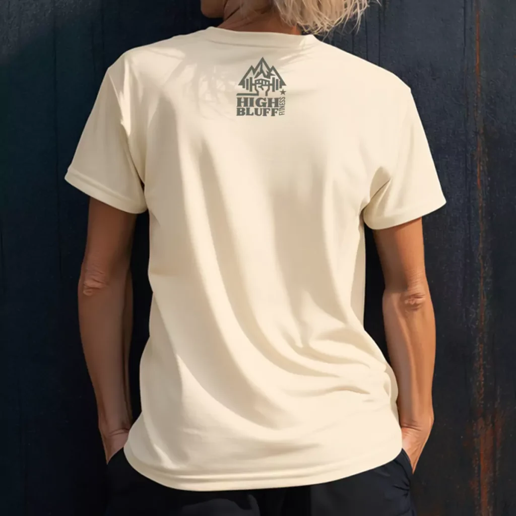 Printed on a natural cream unisex tee, the front graphic stacks "MURPH" in wide block letters filled with a pixelated digital text pattern — dense columns of tiny type that read as texture from a distance and as detail up close. Below the word, two short horizontal rules flank a large bold "25" in a classic varsity jersey numeral style with a dark charcoal shadow offset. The combination of text-fill type on top and a clean sport numeral below gives the design two distinct visual registers. On the back, the High Bluff Fitness mountain-barbell logo prints in warm grey at the upper neckline, sitting small and sharp against the cream base.
