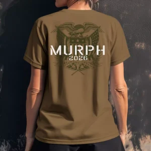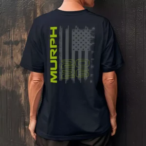 The military green and gold combination does a lot of the heavy lifting here. These murph shirts are built to feel like a commemorative piece rather than a standard gym shirt, and the shield graphic gives them enough visual weight to hold up to that. The kind of crossfit shirt that ends up folded at the top of the drawer instead of in the donation pile.
