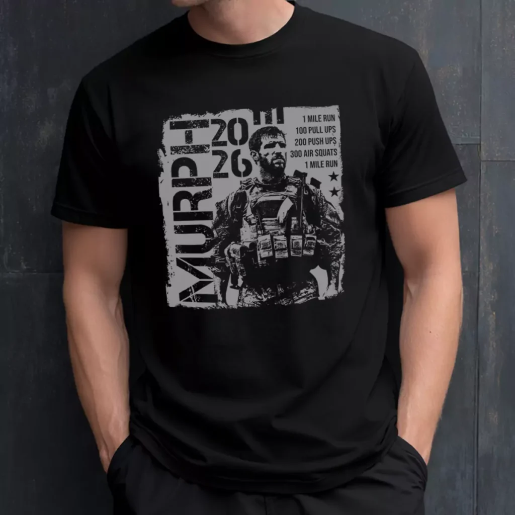Printed in grey on black, the front packs a soldier portrait, large stacked "MURPH 2026" type, the full workout breakdown and two stars into a single distressed block composition. The worn texture throughout ties every element together and keeps it from feeling too clean for the occasion. The gym logo prints white on the upper back — a sharp contrast that works well as a standalone stamp on an otherwise all-front design.