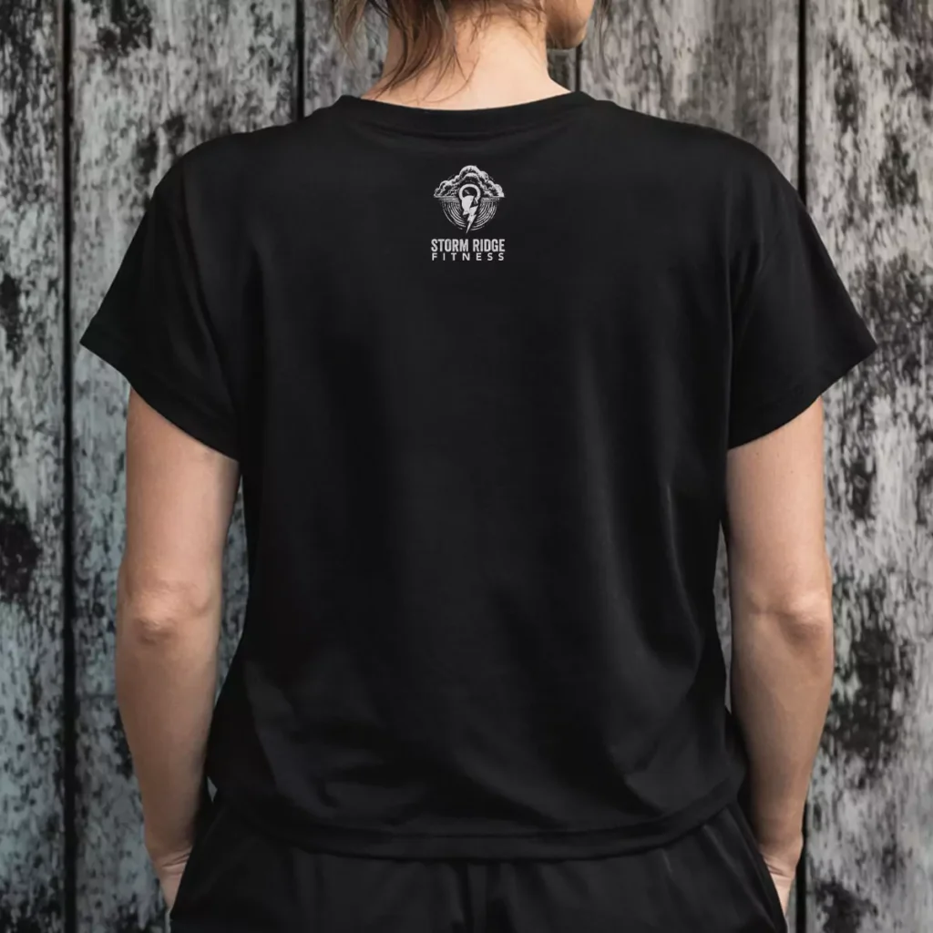 Printed in grey on a black crop cut tee, the front centers a high contrast stencil style soldier portrait with two military stars and the year stacked to the upper right and "MURPH" set in wide stencil type anchoring the bottom. The crop cut is a deliberate garment choice — it moves well and reads as athletic rather than casual, which fits the day. The gym logo prints clean white on the upper back, simple and sharp against the black.