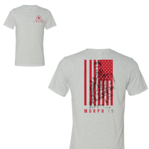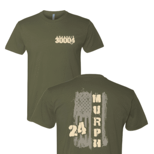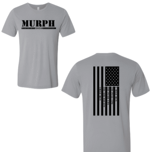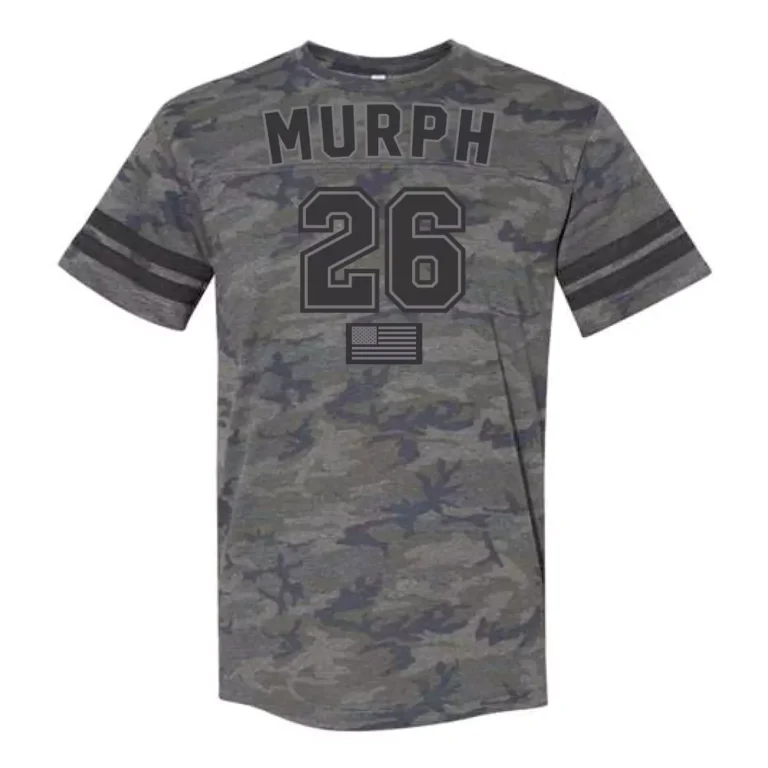 A dark woodland camo football jersey tee with dual stripe sleeve bands gives this concept its foundation, a garment that pulls equally from military tradition and American sport. "MURPH" sits across the upper chest in dark tonal lettering, with a large "26" dominating the center in oversized jersey numerals. A subdued American flag patch anchors the graphic just below the number, small but deliberate. Everything is printed in a near matching dark tone on the camo base, keeping the whole shirt intentionally understated. The stripe sleeve detail is what ties it back to the football jersey format and separates this from every other murph shirt in the lineup.