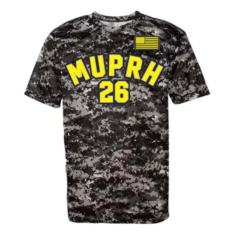 An all over black and grey digital camo performance tee provides a dense, tactical base that reads serious from across the room. The arched "MURPH" lettering with "26" below is printed in bold yellow with a black outline, creating a sharp contrast that cuts through the busy camo pattern with no effort. A yellow American flag patch sits at the right chest, a small but deliberate nod that grounds the shirt in the memorial it was made for. Front center placement keeps the main graphic front and commanding. The yellow and black color combination gives these murph shirts a look closer to a special operations unit patch than a typical CrossFit gym shirt.