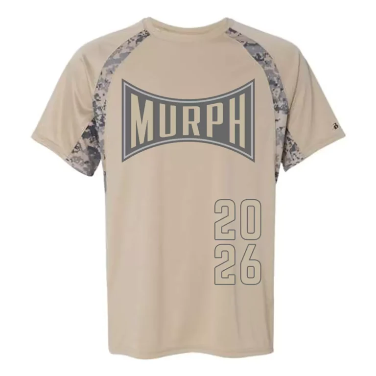 A sand colored performance raglan tee with digital camo sleeve inserts sets a subdued, tactical tone from the start. The chest graphic uses a concave shield shape, a nod to military insignia and combat sports branding, with "MURPH" printed in a muted grey and tan colorway that blends into the garment rather than shouting over it. The placement is front center and large, giving the design authority without going aggressive. The year runs vertically down the lower right front in oversized stacked numerals, an unconventional placement that adds visual interest and keeps the shirt feeling more like a keepsake than a standard event gym shirt.