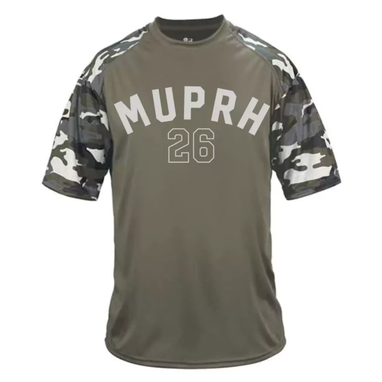 A military olive performance raglan body is paired with woodland camo sleeves in grey, white, and black tones that complement the base without matching it exactly. The arched "MURPH" lettering with "26" below is printed in light grey on the olive chest, keeping the graphic soft and tonal rather than high contrast. Front center placement is clean and direct. The whole shirt reads as a natural fit for the workout it represents, a gym shirt that earns its military reference without leaning on gimmicks.