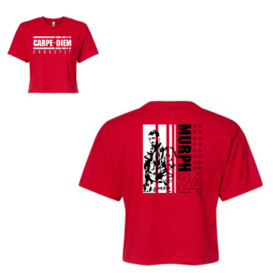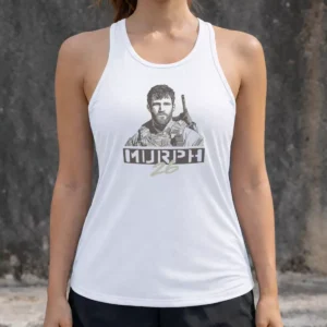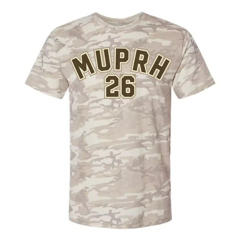 An all over sand and tan camo tee provides a soft, desert toned base that feels both military and wearable at the same time. The arched "MURPH" lettering with "26" below is printed in dark brown with a cream outline, pulling the graphic into the same warm palette as the garment rather than breaking away from it. Front center placement is the natural call on a full pattern shirt like this. The result is a tonal, cohesive gym shirt where every element is working together instead of competing.