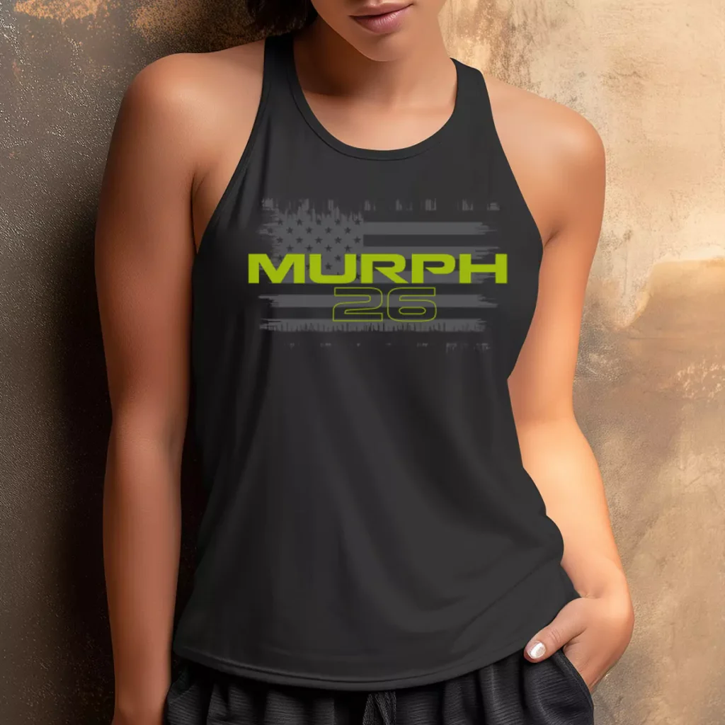 Printed on a black racerback performance tank, the front graphic layers a wide faded grey flag watermark across the upper chest with "MURPH" in bold neon yellow-green sitting directly over it, and "26" in the same neon outlined below. The flag stays fully in the background — textured, distressed, and intentionally subdued — so the neon type is the first thing your eye hits. The Copper Valley Strength rope-and-plate logo prints in tonal dark grey on the upper back neckline, barely breaking from the black of the shirt.