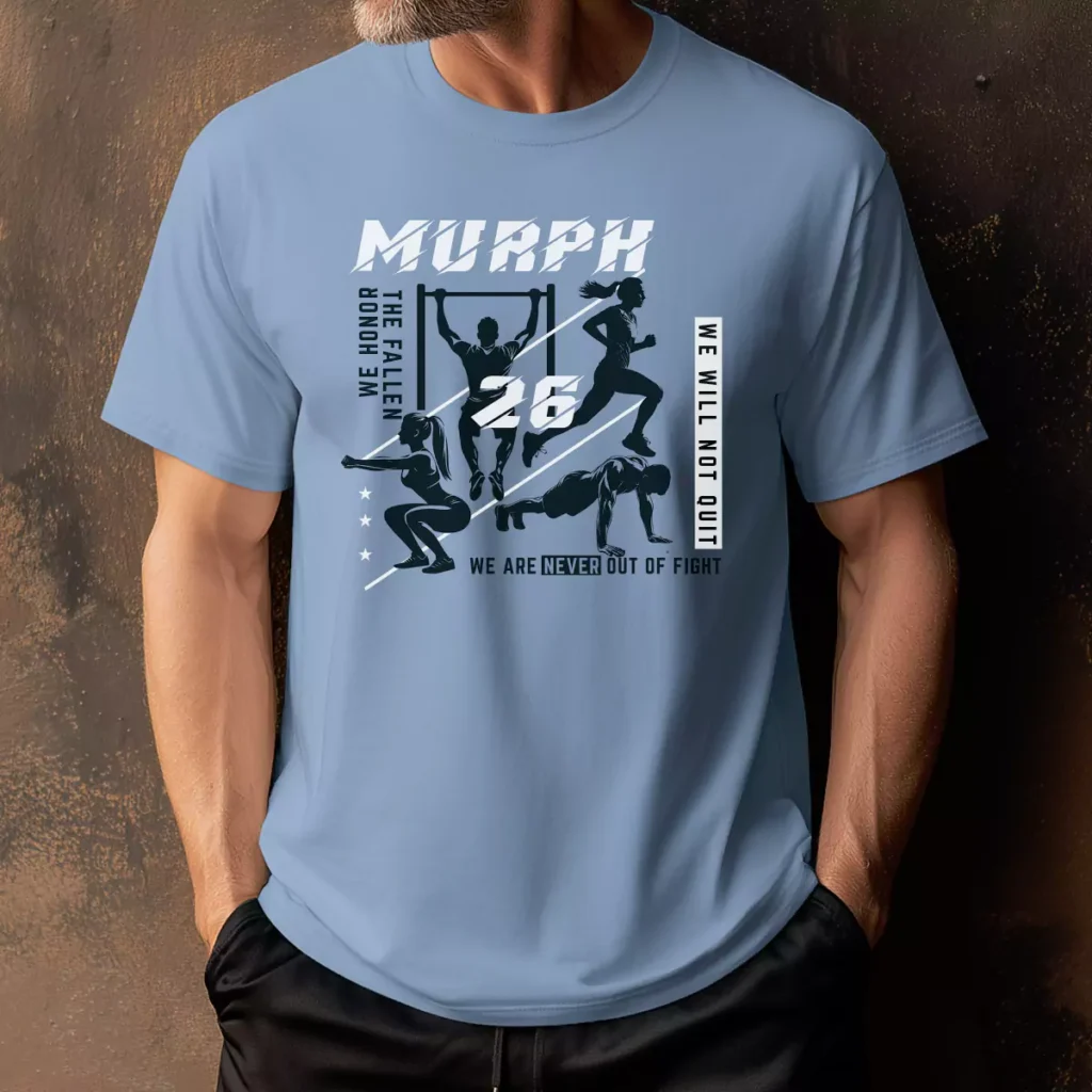 Printed on a steel blue tee, the front carries a full action scene — four athlete silhouettes mid-workout set against a diagonal slash composition with "26" centered bold. "We Honor the Fallen" runs vertically on the left, "We Will Not Quit" on the right, and "We Are Never Out of Fight" anchors the bottom. "MURPH" sits at the top in a wide italic font. The War Hawk hawk and barbell logo prints clean in navy on the upper back. This is one of the most text-rich and compositionally dense designs in the collection.
