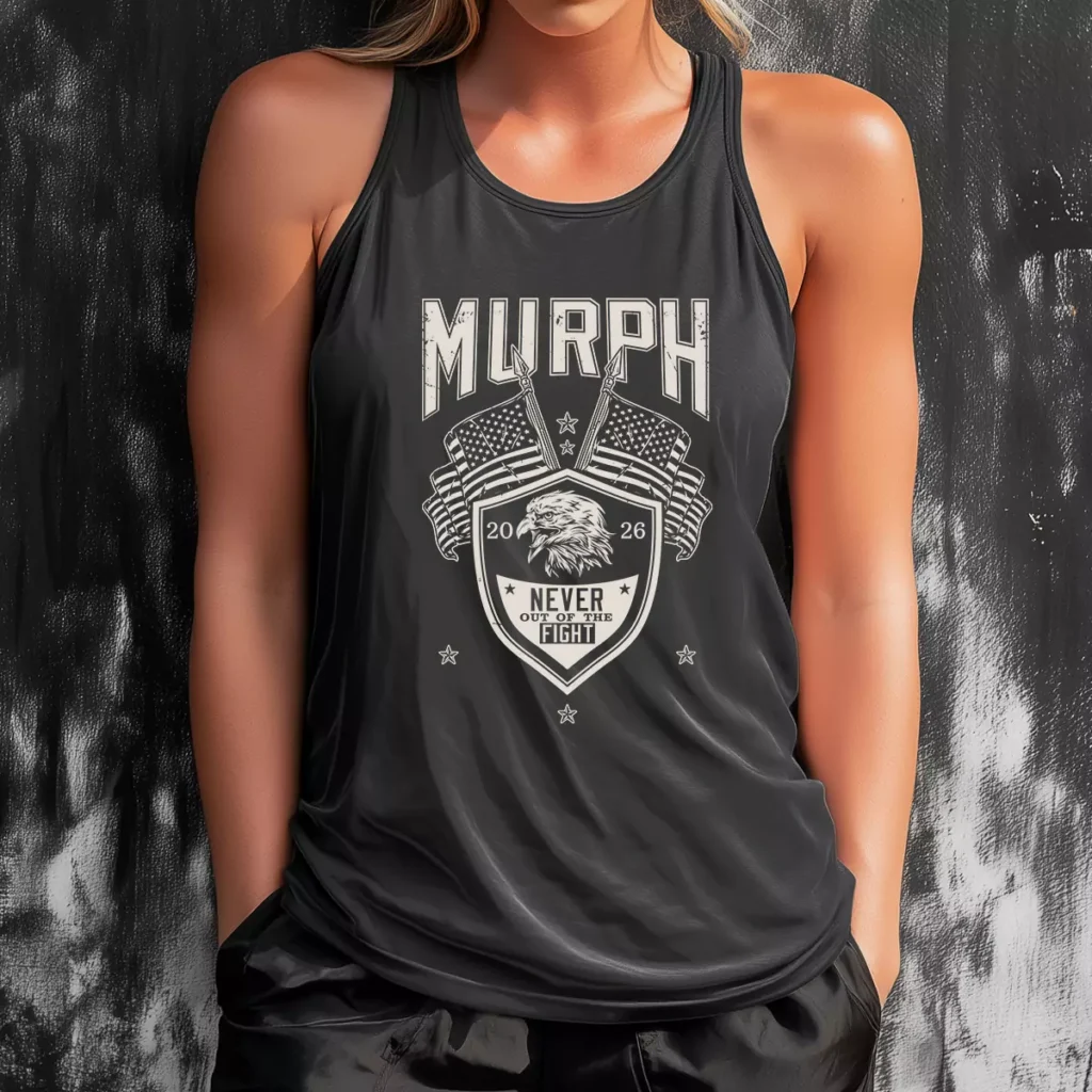 One color. One message. No distractions. These Murph tshirts don't need red, white, and blue to say something meaningful — the eagle, the flags, and "Never Out of the Fight" do that on their own. The charcoal tank keeps it wearable well beyond Memorial Day and these gym shirts hold up exactly as long as the people wearing them.