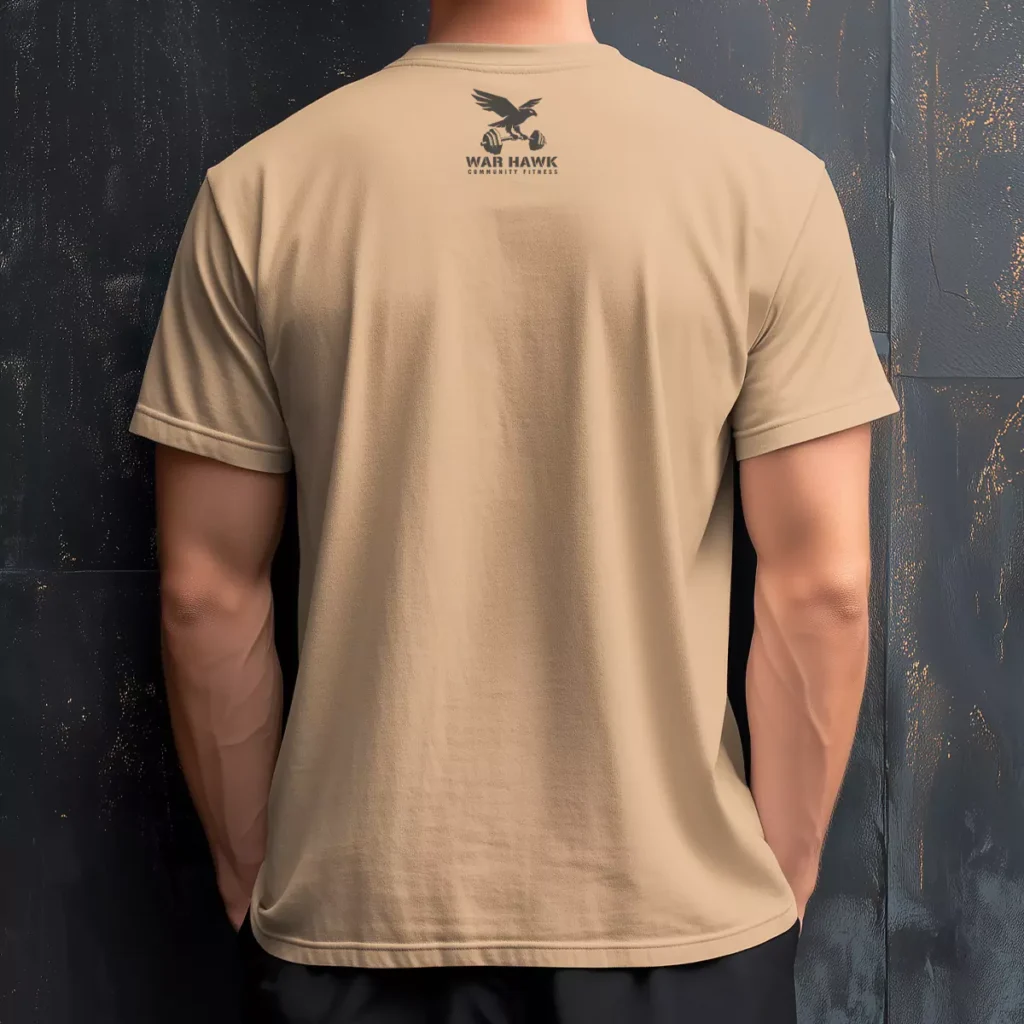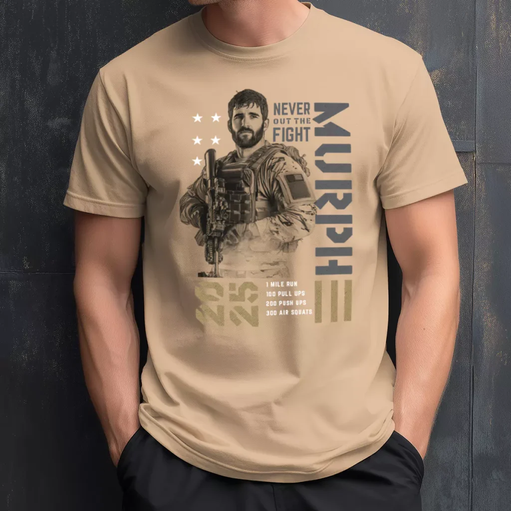 Putting actual words on a murph tshirt changes what it is. "Never Out The Fight" is not decoration, it is the whole point of the day in four words. The tan garment with earth tone inks keeps this one looking like it belongs in the field rather than on a shelf. One of the more complete memorial day workout shirts in the catalog, with enough going on to reward a second look and nothing wasted.