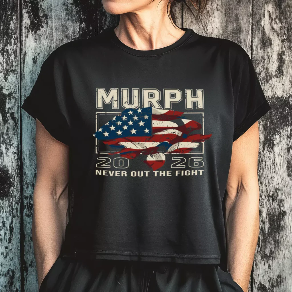 The tagline "Never Out the Fight" earns its place on this shirt because the design backs it up visually. The torn flag treatment gives the graphic genuine tension without going over the top. On a black crop, the full-color flag pops harder than it would on any other base. These Murph tshirts carry a message that goes beyond the workout and that's exactly what makes them worth keeping.