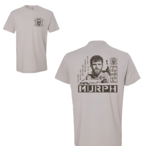 The word MURPH runs large across the front chest in bold block type filled with a military camo texture, stacked above 2025 in spread numerals with stars between each digit. All of it is printed in desert tan on a black tee. The gym name and logo sit quietly on the upper back. Clean placement, nothing extra.