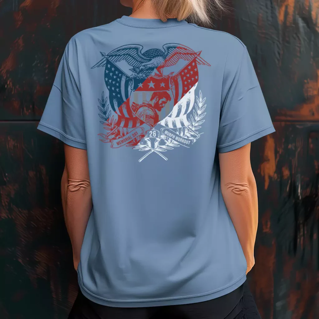 The full color crest on steel blue is a significant step up in visual weight — the red, white, and blue illustration pops hard against the cool fabric. The vertical front logo treatment is a confident move that most gyms wouldn't try. These Murph tshirts look as good walking in as they do walking out.