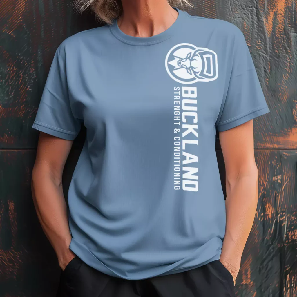 Printed on a steel blue performance tee, the back carries a full color heritage soldier crest illustration — red, white, and blue rendered directly on the fabric, bringing the patriotic palette to life in a way a single-color version can't. The front features the Buckland Strength & Conditioning kettlebell bull logo with the gym name running vertically in bold white — an unconventional front placement that uses the full height of the shirt. Two distinct sides, one cohesive design.