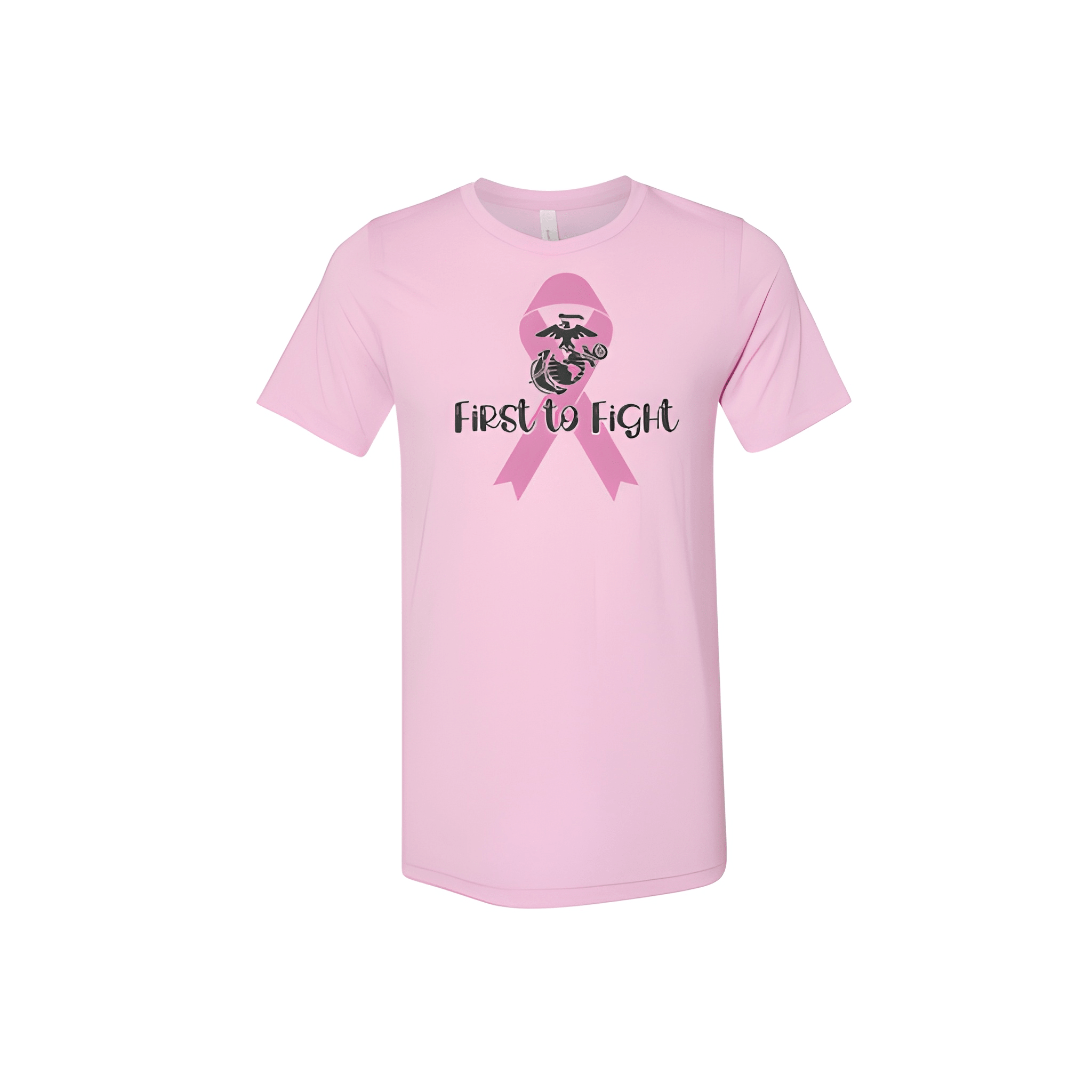 We placed "First to Fight" bold on a soft pink triblend tee with lavender accents for a warm approachable fundraiser look. The Bella triblend was chosen for its ultra soft feel and flattering fit. Centered chest placement keeps the message front and center.