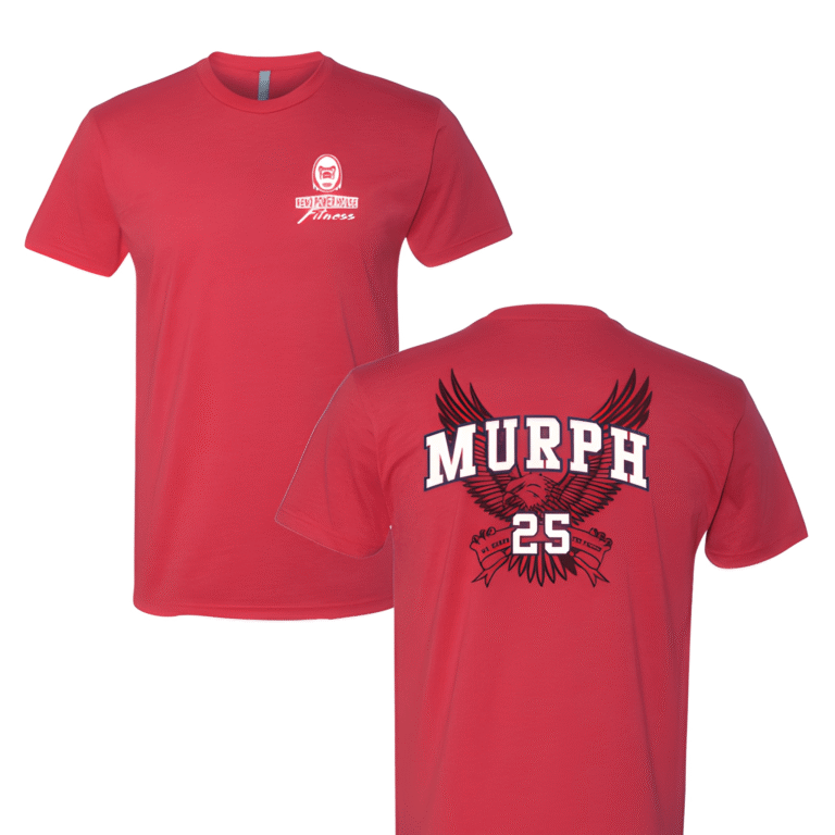 The back centers a full spread eagle with "MURPH" set in bold varsity block letters across the bird's chest and "25" anchored below it. A ribbon banner at the base reads "We Honor the Fallen." All of it is printed in black and red on a heather red tee, keeping the palette tight and unified. The gym logo sits on the front left chest, small and clean. Standard placement up front, but the back is where this memorial day workout shirt does its job.