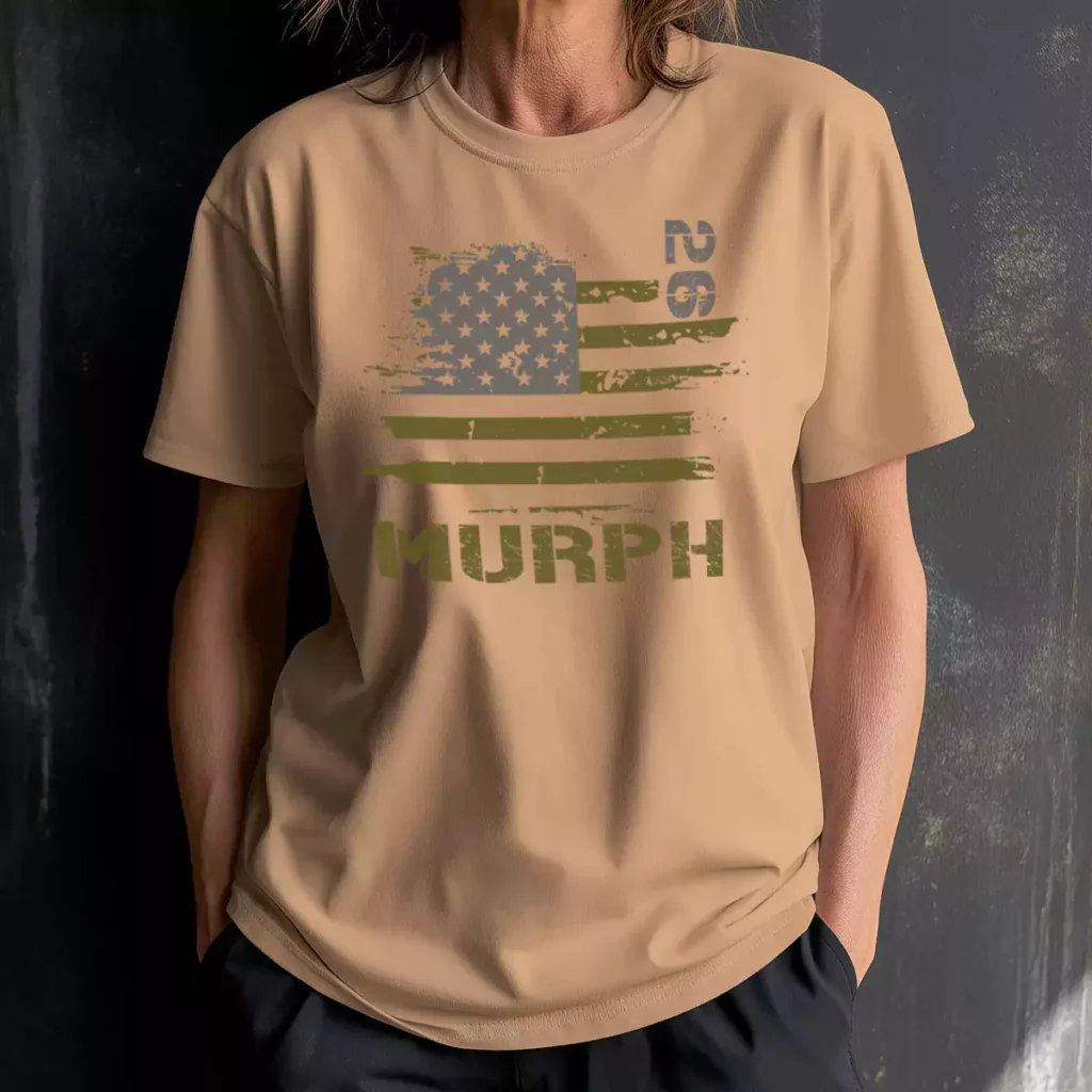 This is one of the more restrained Murph shirt designs in the portfolio and it earns that restraint. The two-tone tonal approach feels worn-in from the start, like a shirt that's been through something already. The tan base and olive print combination reads authentically military without relying on the usual red and blue. These Murph tshirts are built for people who don't need the shirt to shout.