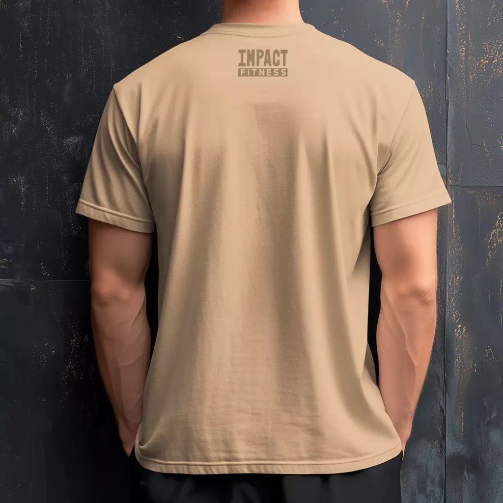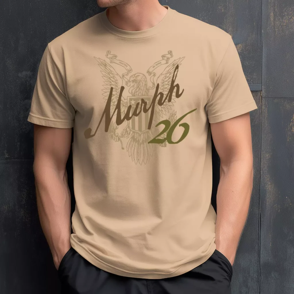 Printed on a light sand tee, the front layers a faded heritage eagle crest in pale tan behind a bold cursive "Murph" script in dark brown, with "26" in olive green dropping below it. The ribbon banners on the crest read "Together" and "We Honor" — visible on close inspection but not competing with the type. The Impact Fitness wordmark prints tone-on-tone in tan on the upper back. The contrast between the flowing script and the formal crest illustration is what makes this one stand out — it feels almost like a college pennant crossed with a military commendation.