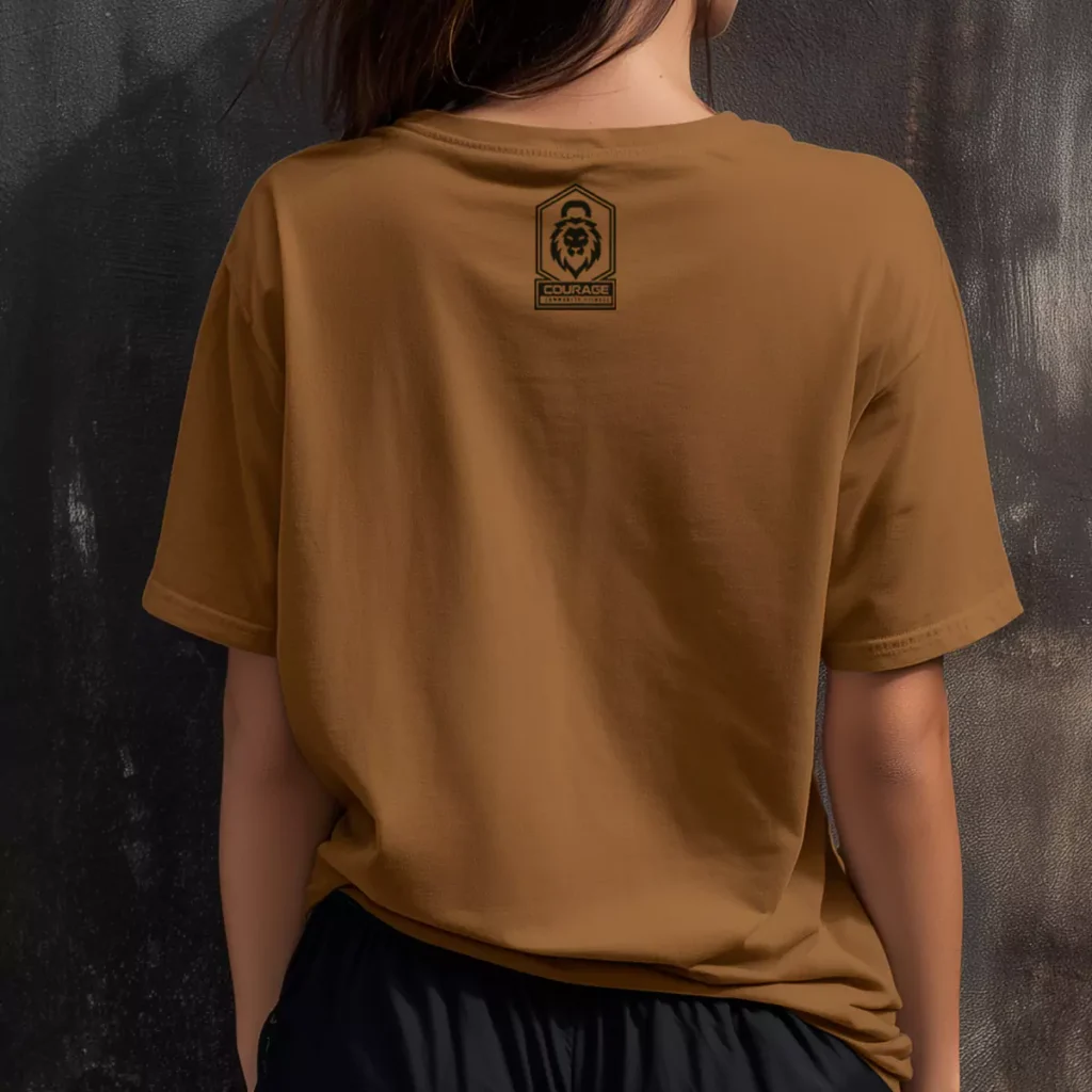 Printed on a copper brown oversized tee, the front centers a large circular coin-style illustration — a detailed line art portrait of a soldier in full kit with an American flag patch on the sleeve, set against a faint cityscape background. The workout runs around the outer ring of the circle: 1 mile run, 100 pull-ups, 200 push-ups, 300 air squats, 1 mile run. "MURPH" and "2026" anchor the interior. The Courage Community Fitness lion badge logo prints tone-on-tone in dark brown on the upper back. The coin format is rare in this space and it lands with real weight.