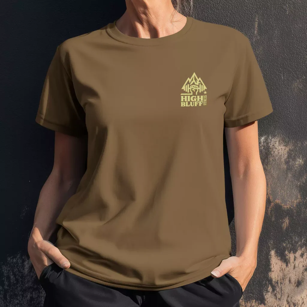 Printed on a coyote tan tee, the back features large "MURPH" lettering filled with a star-pattern digital camo in olive and sage green — a subtle but meaningful nod to military service that goes beyond standard camo. Small green stars separate the digits in the "2 0 2 5" year treatment below. The High Bluff Fitness mountain and barbell logo prints in matching lime green on the front left chest. The star detail is quiet but intentional — exactly right for the day.