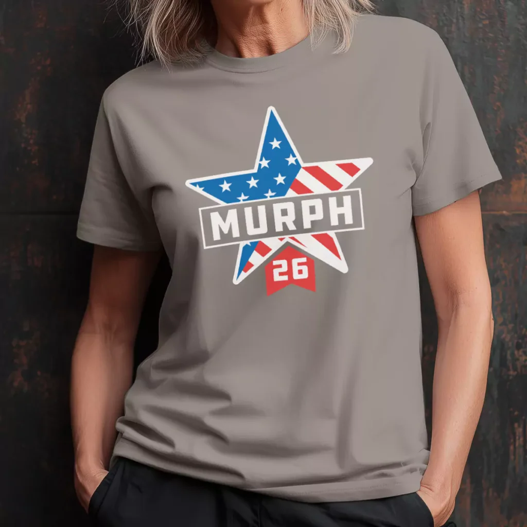 Printed on a light grey unisex tee, the front graphic is a large flag-filled star with red, white, and blue built right into the shape. "MURPH" cuts across the middle in a bold white box, with "26" stamped below in a red chevron to mark the year. The Storm Ridge logo lands clean and white on the upper back. The muted grey shirt keeps the colors from going overboard and gives the whole thing a worn-in, classic feel.
