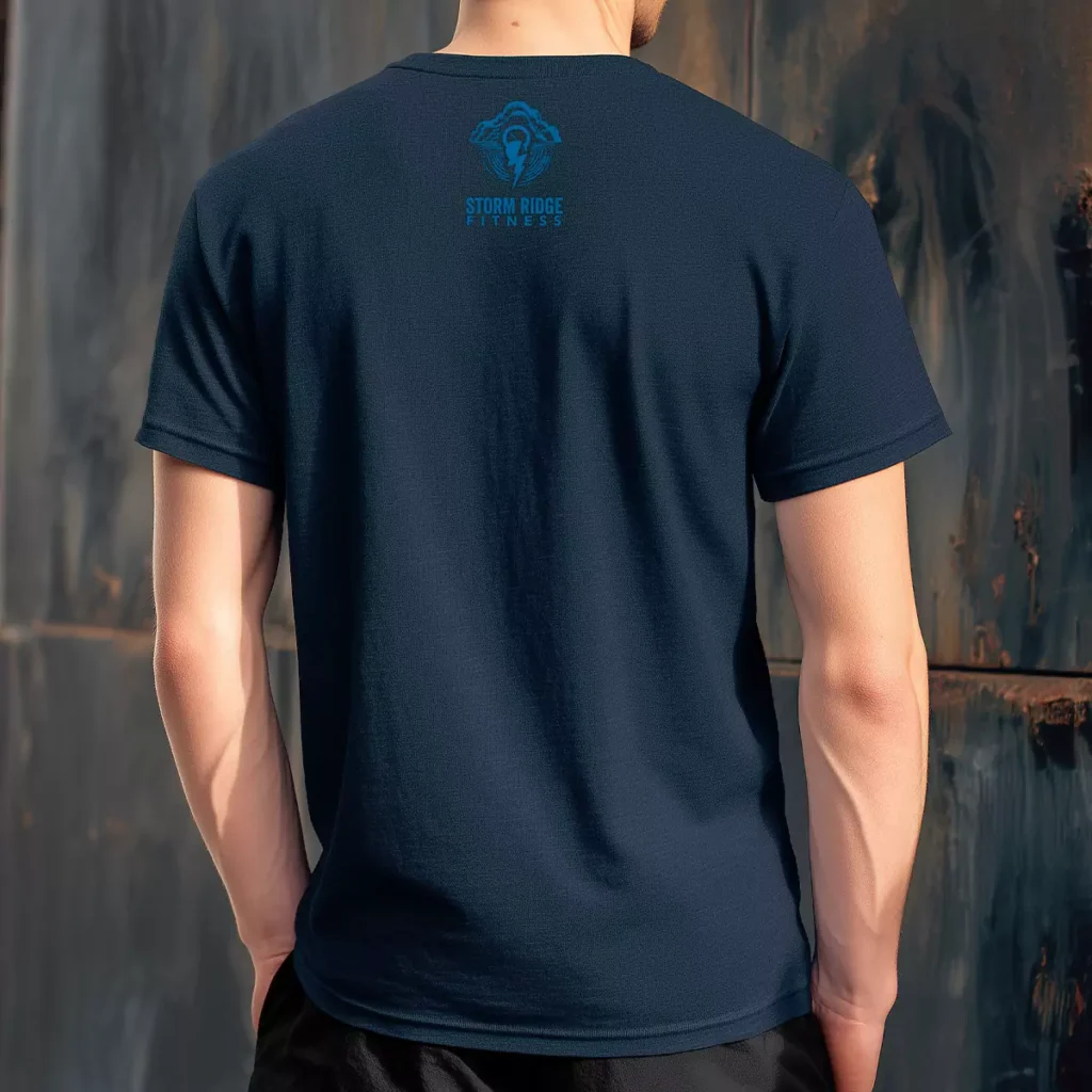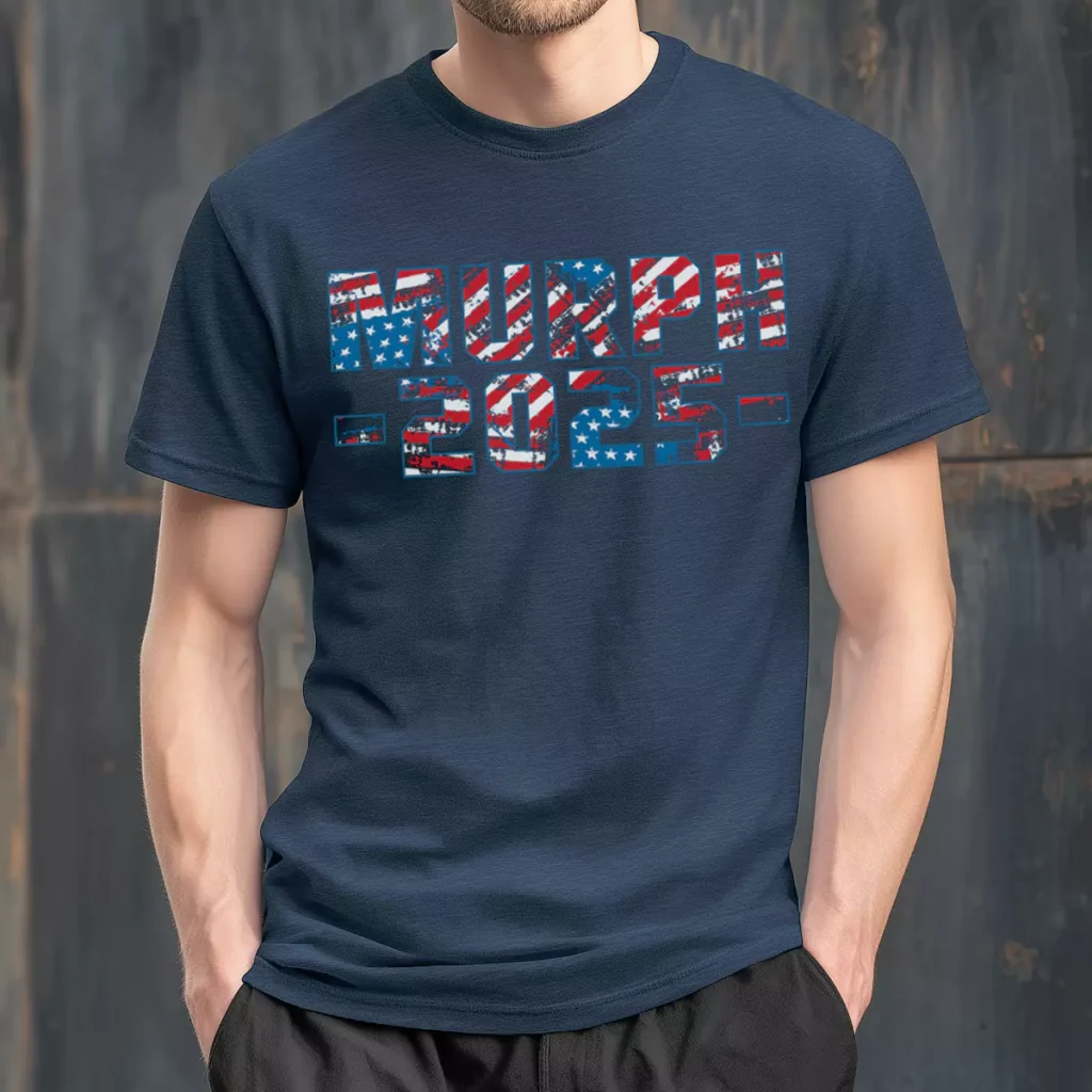 Flag fill lettering on navy is one of the more traditional directions for Murph gym shirts and this version earns its place by committing fully to the worn-in texture rather than using a clean, glossy flag print. The distressed treatment makes the whole shirt feel like it has already been through something. The royal blue back logo against navy is a subtle tonal choice that keeps the branding present without competing with the front. These Murph tshirts are built for gyms that want something that looks like a classic without feeling generic.
