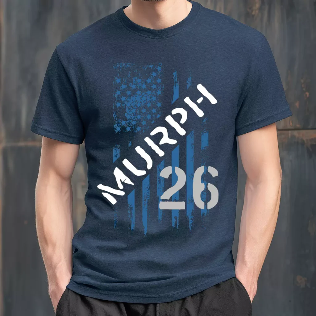 Printed on a navy unisex tee, the front graphic layers a large faded flag watermark — stars and vertical stripes in a slightly lighter blue — behind a bold diagonal stencil bar carrying "MURPH" in white. A large "26" sits below in white stencil lettering, grounded against the tonal flag. The entire design lives in a two-tone blue and white palette with no red in sight, which is a deliberate departure from the usual patriotic color set. On the back, the Courage Community Fitness lion badge logo prints in a deep tonal blue, nearly disappearing into the shirt — subtle enough that you almost have to look twice.