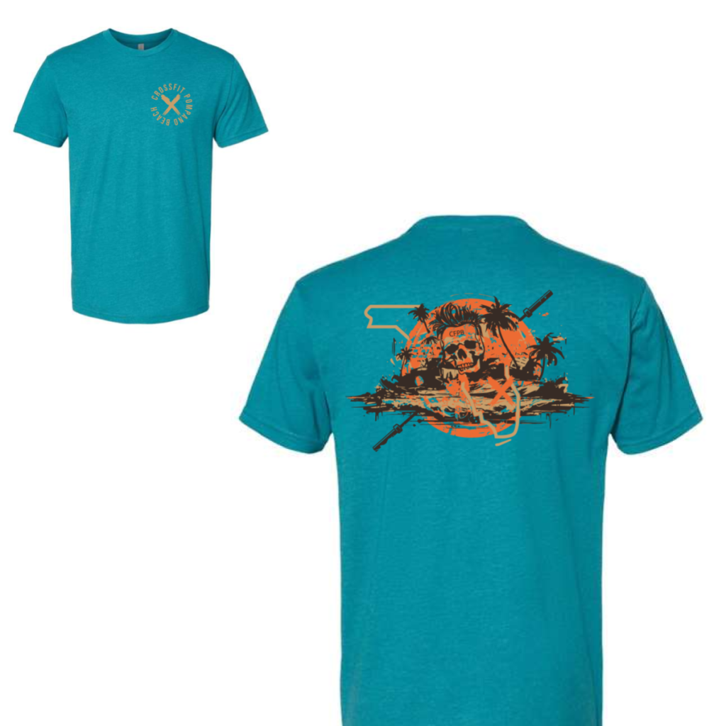 CrossFit Panama Beach Skull Back Tee This shirt brought a bold beach and training mix. Overview We used a bright teal tee to match the coastal setting. The front kept a small chest logo for a clean look. The back featured a large skull design layered with palm trees, a sunset, and barbell elements. Orange […]