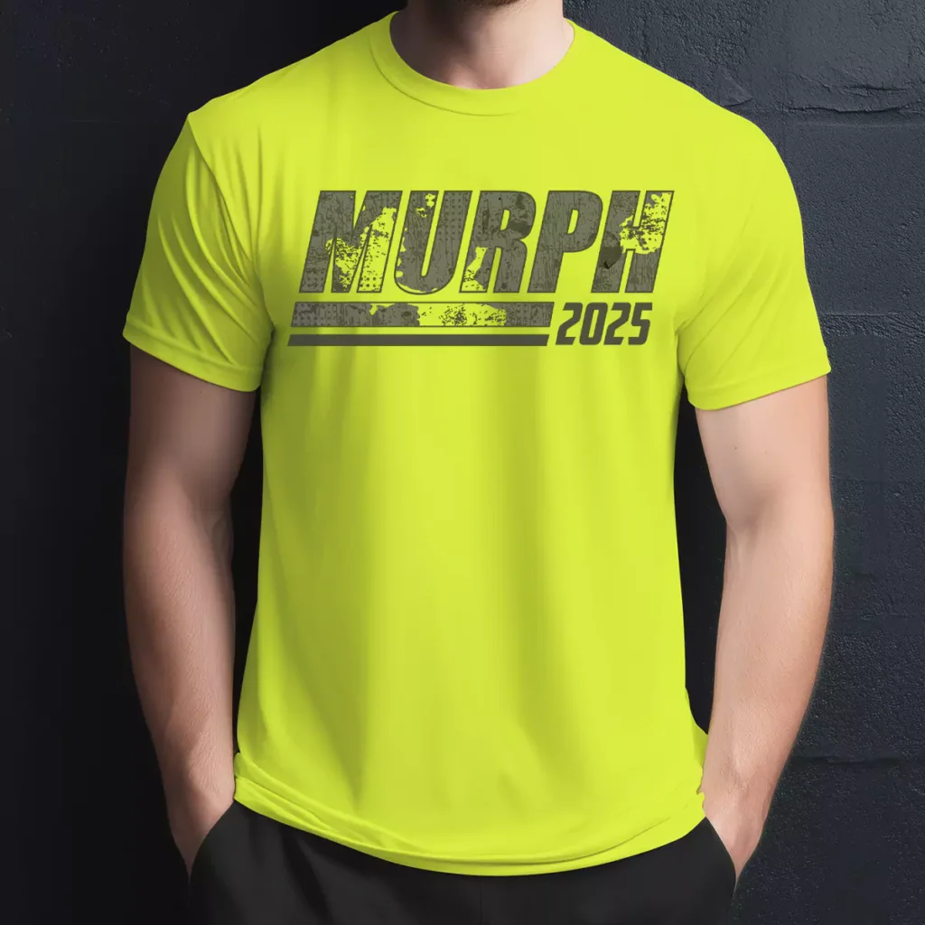 Hi-Vis | UNITEE Graphics Hi-Vis Firebolt Strength picked the loudest shirt in the room to carry the quietest message of the year. Overview Printed on a safety yellow unisex performance tee, the front graphic sets “MURPH” in large distressed block letters filled with a dark olive camo texture — cracked, worn, and deliberately rough against […]