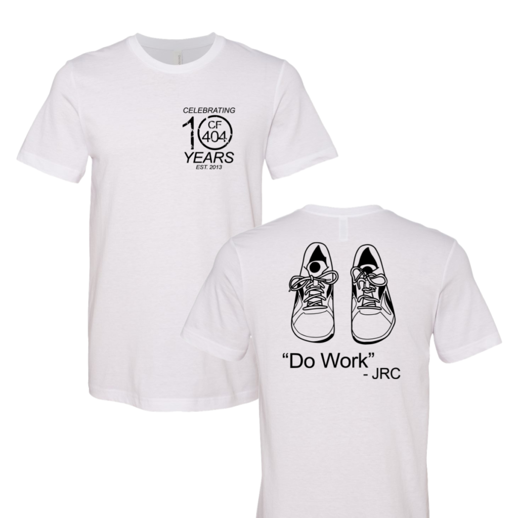 CF404 10 Year Do Work Shirt This shirt marked a big milestone with a simple and strong message. Overview We used a white tee for a clean and timeless look. The front design highlighted the 10 year mark with a simple badge style. The back featured a bold quote with a shoe graphic to connect […]