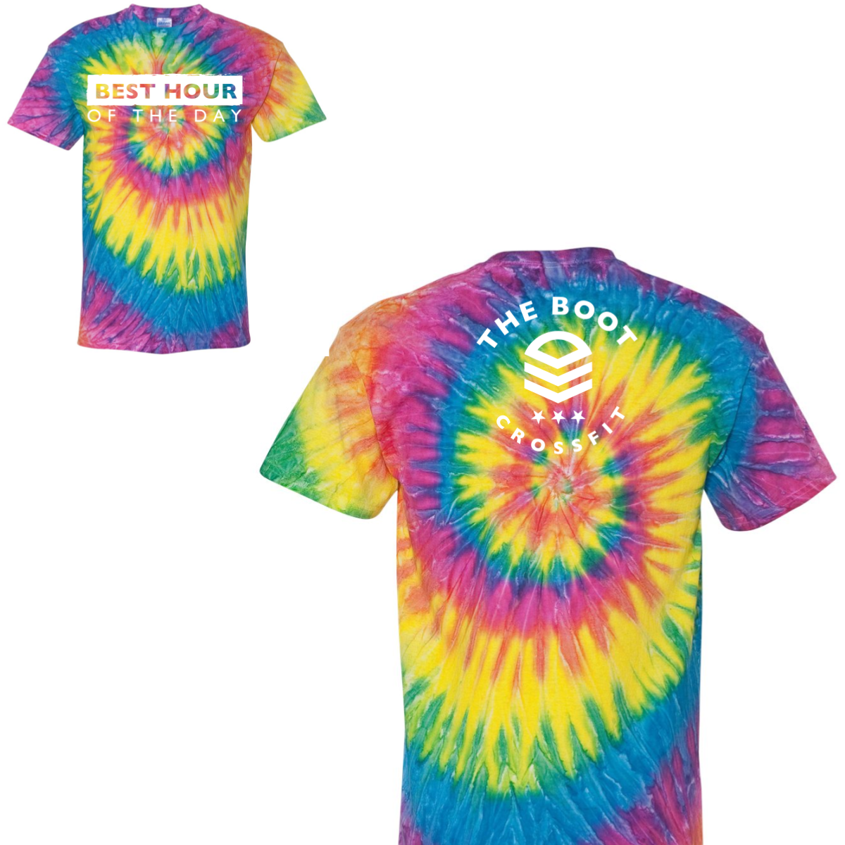 We used a bold tie dye shirt with bright summer colors. The front had a simple Best Hour Of The Day message in white. The back featured The Boot CrossFit logo with a clean stacked icon. The print stayed high contrast so it stayed easy to read. The layout kept both sides clear and balanced.