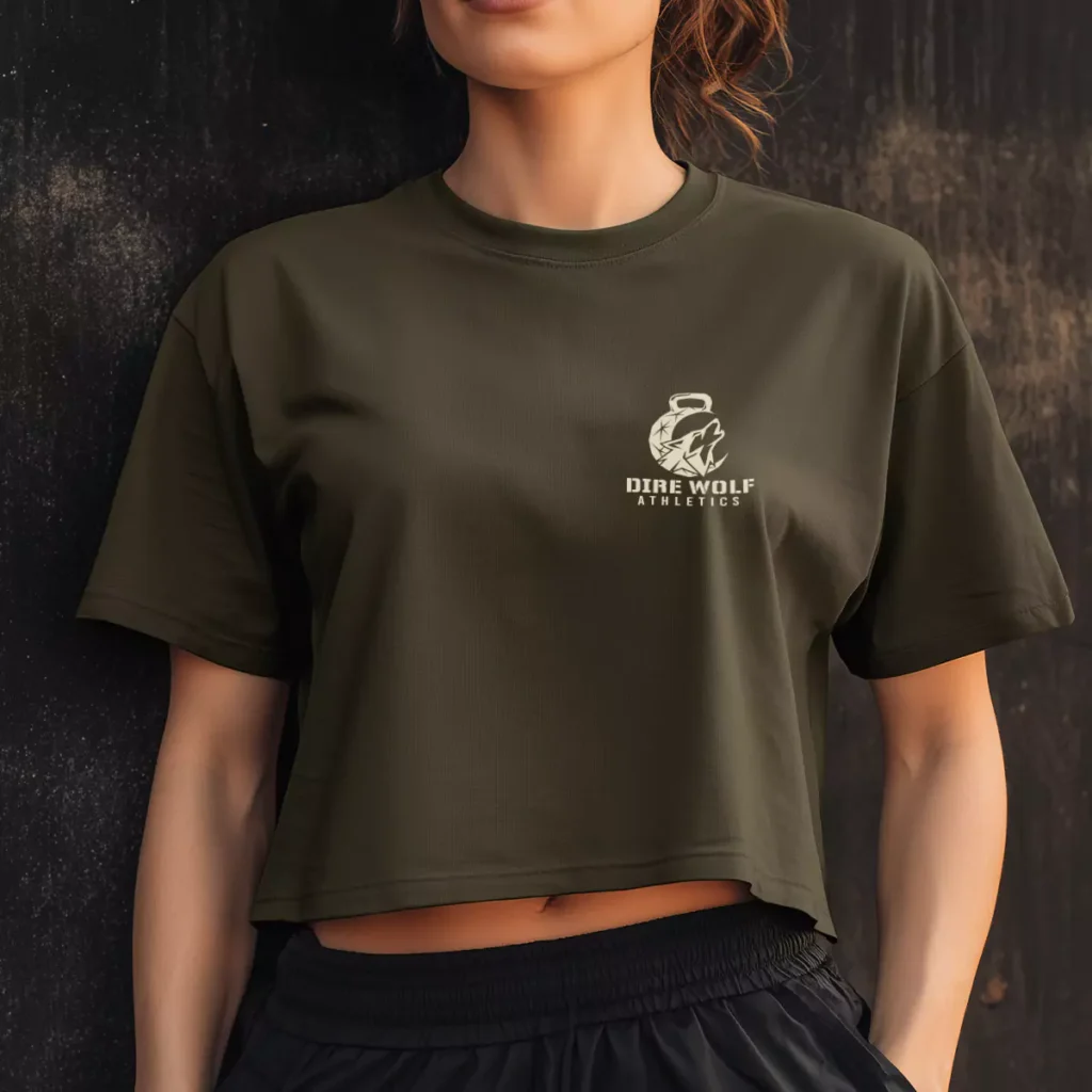 The crop cut makes this one of the more wearable murph shirts in the portfolio. It steps outside the standard unisex tee and gives female athletes a shirt they actually want to train in. The shield design is bold enough to stand on its own but simple enough that it does not feel overdone.