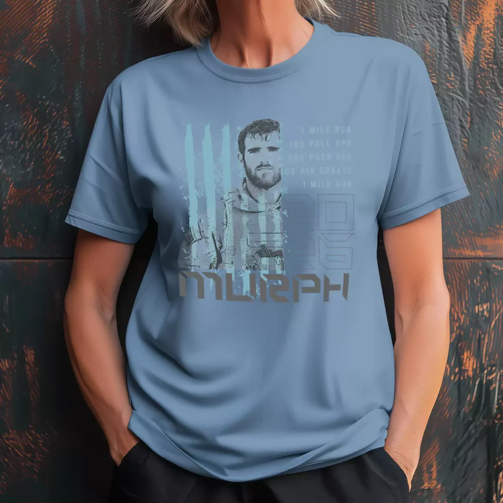 Printing the actual workout on the shirt is a detail that lands differently for people who have done it. It is not decoration, it is a reminder. The tonal palette keeps it from being loud while the stencil type and fragmented lettering give it a worn in, utilitarian feel that suits the day. As gym shirts go this is one of the more honest murph tshirts out there.