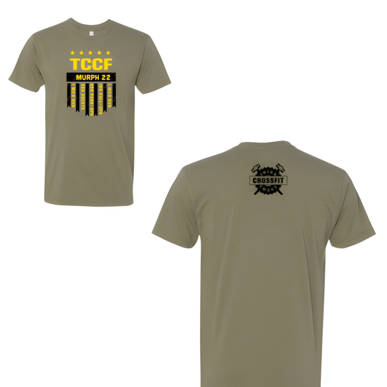 The front stacks five gold stars over a bold "TCCF" abbreviation, then drops a black banner with "MURPH 22" in gold lettering. Below that, five vertical ribbon banners each carry one movement from the workout in rotated type. It turns the workout itself into the visual. The back stays minimal with the gym's circular logo in black at the upper center. Everything is printed in gold and black on a military green tee — a palette that earns its place without trying too hard.