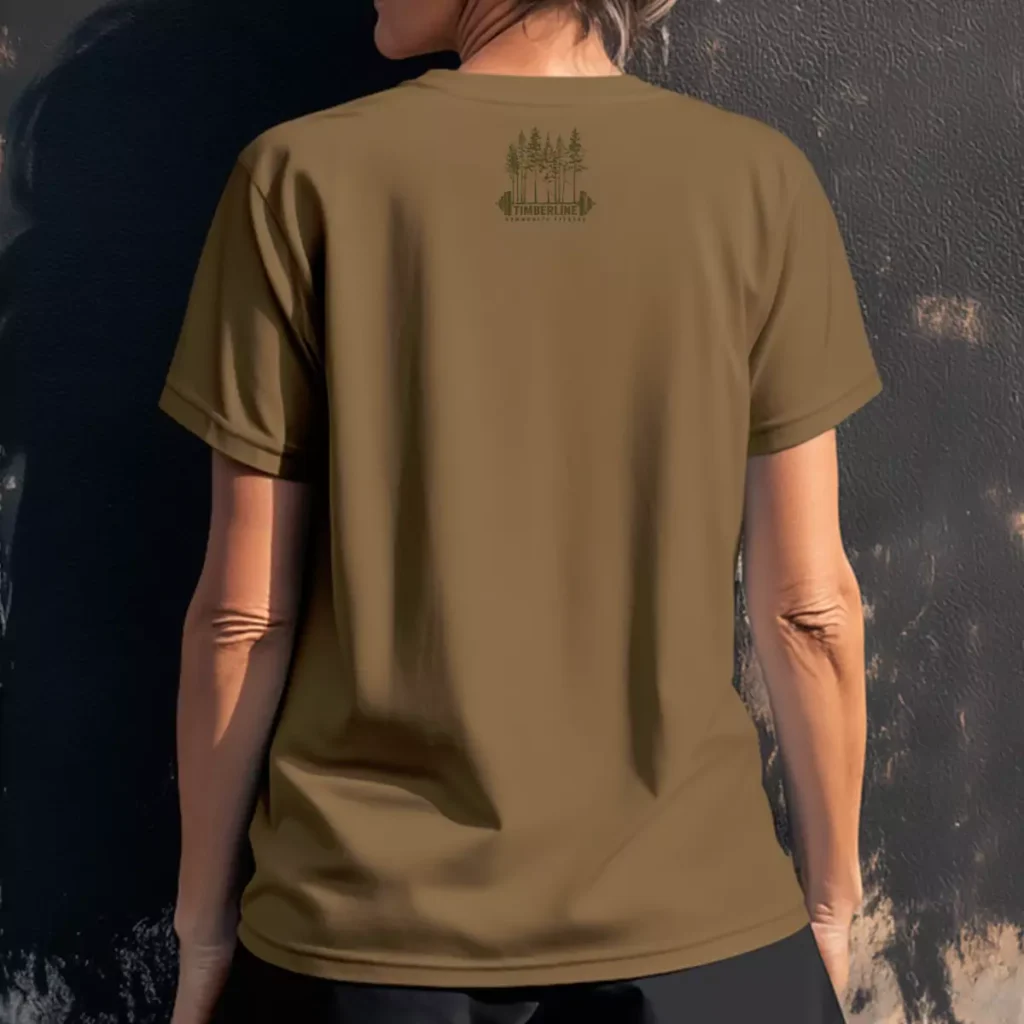 Printed on a coyote brown tee, the front centers a detailed two-color soldier portrait in olive green and white with a tactical crosshair overlay behind the figure. The year "2025" stacks vertically to the right in the same olive green with two stars flanking it, and "MURPH" runs in wide white stencil type below the portrait, clean and grounded. The back carries the Timberline Community Fitness pine tree barbell logo in tone-on-tone olive at the upper yoke. The crosshair registration marks behind the portrait are the design detail that elevates this beyond a standard illustration shirt. They frame the soldier the way a mission brief or an intelligence dossier would, adding a layer of tactical seriousness that fits the tribute without being heavy-handed. The two-color olive and white palette on coyote brown keeps everything in the same military field family. These murph tshirts were made for a gym that approaches Memorial Day with the same intentionality the day deserves.