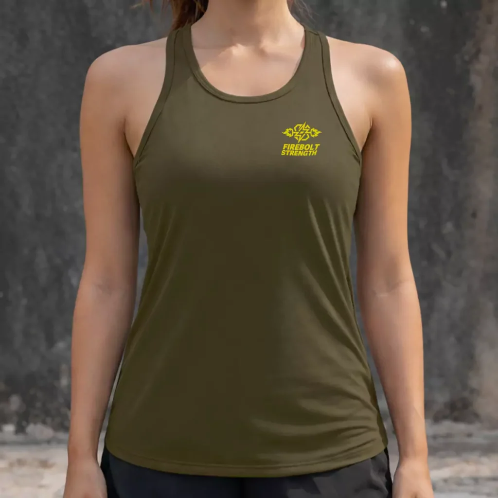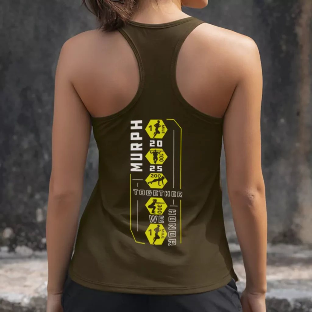 Printed on a military olive racerback performance tank, the entire back is a vertical layout running the full length of the shirt — "MURPH" horizontal at the top, then each movement stacked in bright yellow hex badges with rep counts, the year split across the center, "Together" as a midpoint break, and "We Honor" running vertically alongside the final movements. The Firebolt Strength flame logo prints in matching yellow on the front left chest. Nothing on this shirt is wasted space — every element flows into the next.