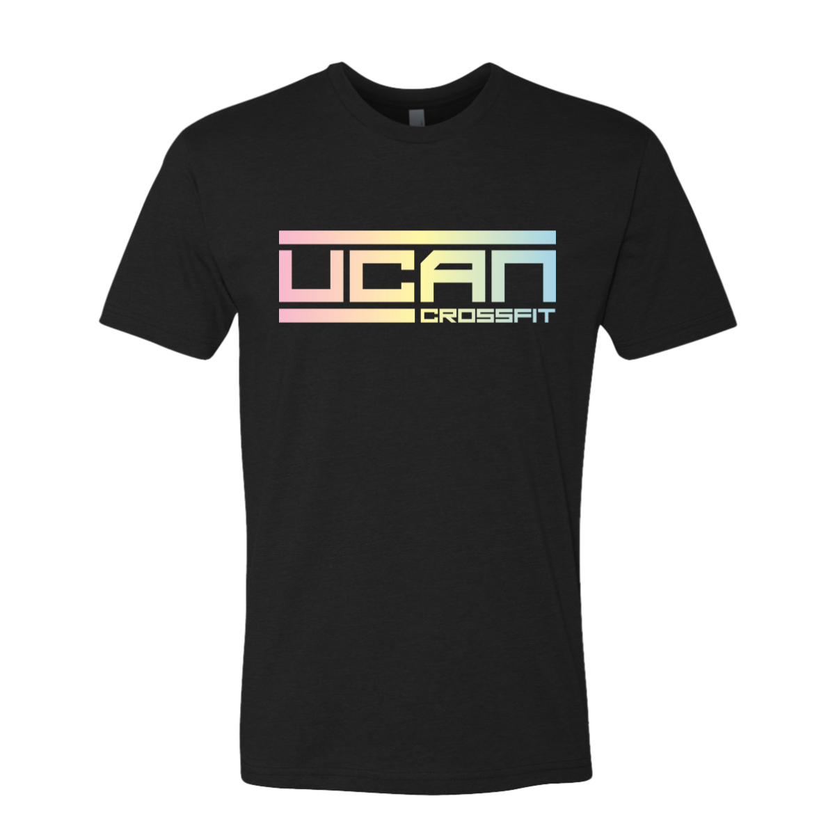 We used a black shirt to let the colors stand out. The front design featured a wide UCAN logo with a smooth gradient blend from pink to yellow to blue. Clean lines and block lettering gave it a strong and modern feel. The layout stayed wide across the chest for impact. The soft fabric made it great for daily wear.