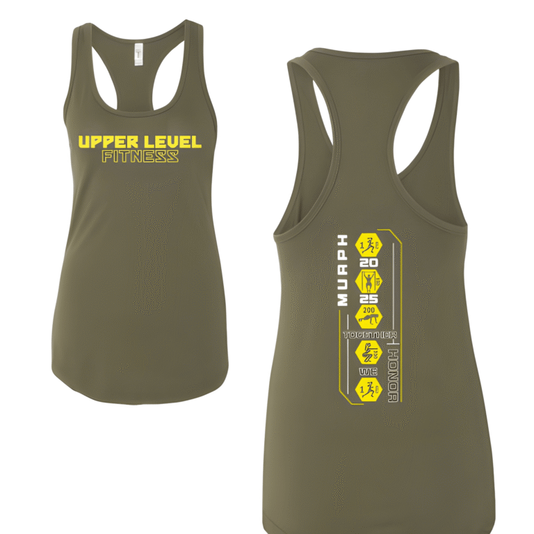 The design was printed in bold yellow and white on an olive drab racerback tank. Yellow on OD green is a military staple — it reads urgent and earned at the same time. The back graphic runs vertically down the center with hexagon movement icons stacked alongside the classic Murph rep counts: 1 mile, 100 pull-ups, 200 push-ups, 300 squats, 1 mile. That vertical spine layout gives it more of a tactical patch feel than a standard gym shirt. The front keeps it clean with just the gym name in a bold military style font. The racerback cut was a smart pick for a workout this grueling since it stays out of the way while you move.