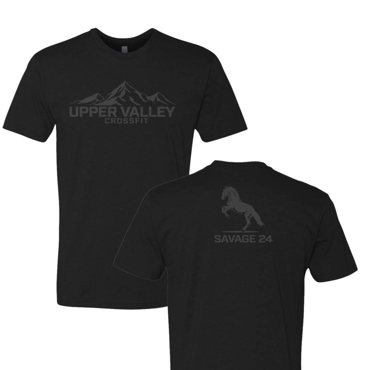 We used a black shirt with a tonal print for a subtle and clean feel. The front featured a mountain logo with Upper Valley CrossFit in a soft dark ink. The back added a small horse mark with Savage 24 for extra detail. The low contrast print kept the look minimal and sharp. The fabric was soft and made for everyday wear.