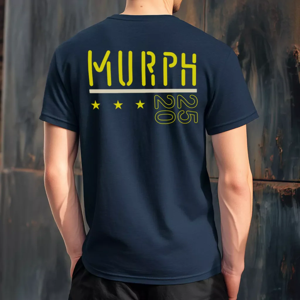 The electric yellow on navy is one of the boldest color moves in this year's Murph shirt lineup and it works because the design is confident enough to carry it. The back placement lets the full stencil type composition do what it was built to do. These are the gym shirts people grab off the shelf first because they look like something, not just a reminder that a workout happened.