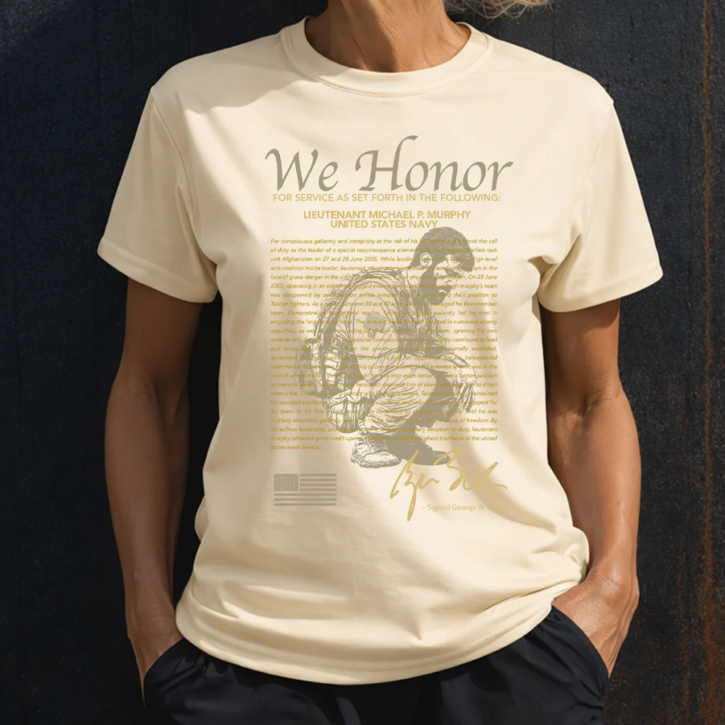 Most Murph shirts nod to the workout. This one goes straight to the source — the actual Medal of Honor citation signed by President George W. Bush, printed on the shirt word for word. That's not a design choice. That's a stance.