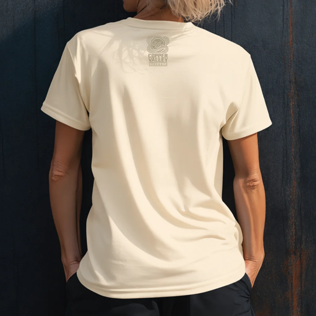 Printed in gold and warm grey ink on a natural cream tee, the full-front design layers the official citation text over a faded illustration of a kneeling soldier. A script "We Honor" headline and the presidential signature anchor the piece. The gym logo sits quietly on the upper back in a tone-on-tone print that keeps the focus where it belongs. These murph tshirts lean closer to a framed document than a standard gym shirt.