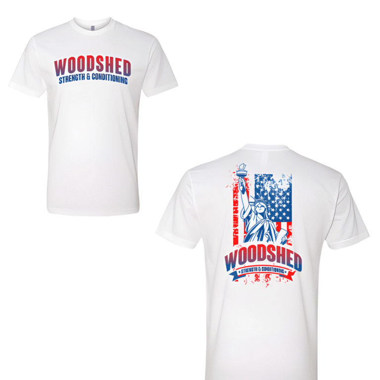 The back is the main event: a full color Statue of Liberty stands in front of a distressed American flag, all printed in red, white, and blue on a crisp white tee. The gym name runs bold below the illustration in the same red to blue color treatment as the front. Up front, "Woodshed Strength & Conditioning" arches across the chest in that same red and blue gradient, keeping the identity visible without overcomplicating it. White was the right garment call here because it lets the full color artwork breathe without anything competing for attention.